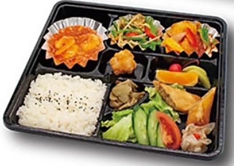 海老のチリソース煮/チンジャオロース/白身魚の甘酢煮/春巻き/焼売/海老のクルトン揚げ/サラダ/ザーサイ/ライス/フルーツ ※ご注文は1個から承ります ※デリバリーは行っておりません ※お弁当に関しては事前のご予約をお願いいたします