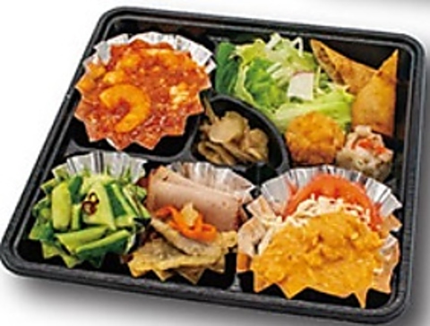 海老とイカのチリソース煮/棒棒鶏/チャーシュー/アジの南蛮煮/焼売/海老のクルトン揚げ/春巻き/叩きキュウリ/サラダ/ザーサイ ※ご注文は1個から承ります ※デリバリーは行っておりません ※お弁当に関しては事前のご予約をお願いいたします