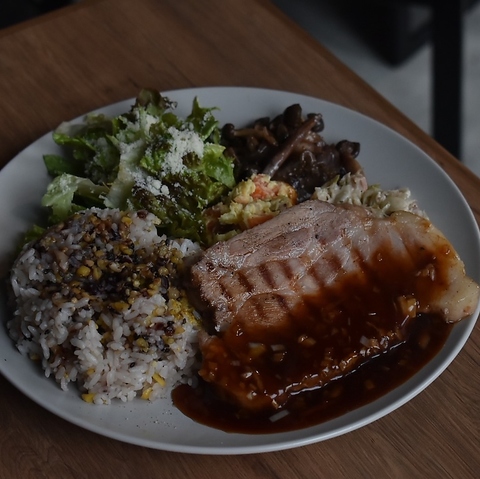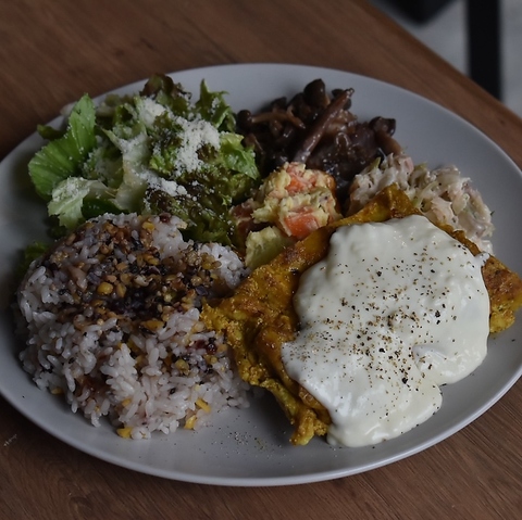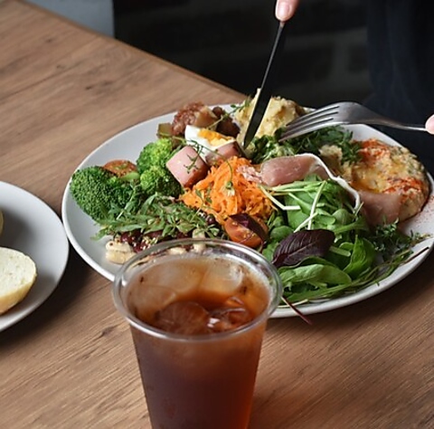 新鮮な野菜をふんだんに使った多彩なデリとサラダが主役のプレートです。栄養バランスも良く、ヘルシーでボリューム満点!パンと選べるカフェが付くのもお得なポイントです。他にもさまざまなメニューをご用意していますので、ぜひご利用ください。先会計制のため、お席を確保後にレジでご注文してください。