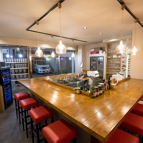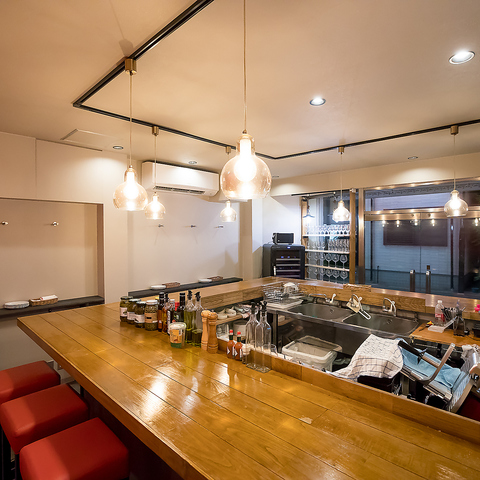 【店内雰囲気】温かみのある木のカウンターとおしゃれな照明が特徴です♪落ち着いた雰囲気で、リラックスしながらお食事を楽しめます!カウンターメインの店内は、ご友人や大切な人との会話を楽しむのに最適!全面ガラス張りの入り口で、開放感のある空間となっております♪