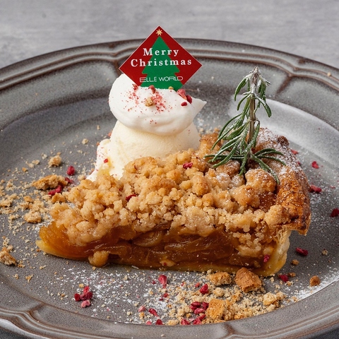 ほろ苦く煮た青森県木村りんご園のりんごを贅沢に使ったアップルパイ。上にはザクザクのクランブルを乗せ食感をプラス。バニラアイスと共に熱々をお召し上がりください。