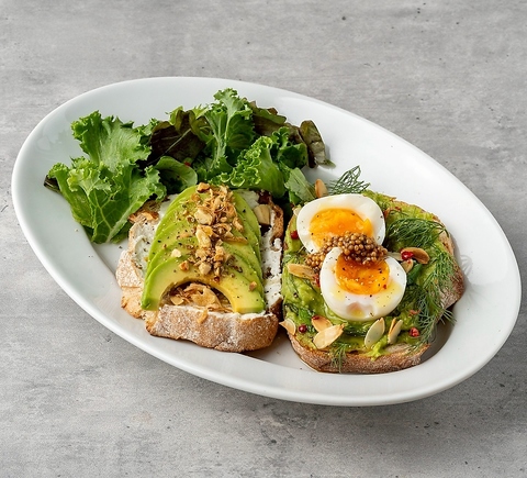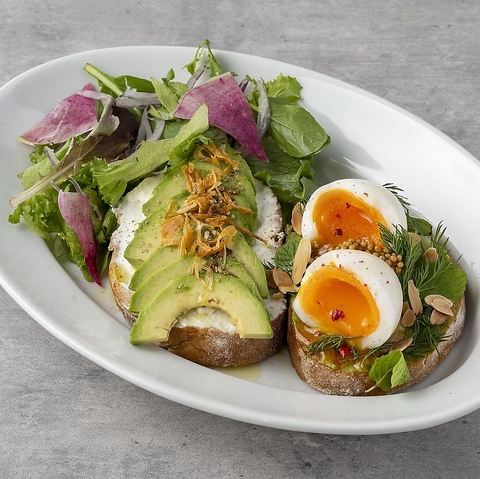 2種類のテイストを一度に楽しめる豪華な一品です。1つはマスカルポーネチーズにアボカドを合わせ、もう1つはワカモレに半熟の蘭王卵とハーブを合わせました。《 ヴィーガン対応可 Vegan option available 》