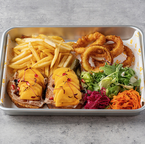 [TAKE OUT専用メニュー]柿と生ハムのオープンサンドと、フライドポテト、フライドオニオン、サラダをセットでご用意。ソフトドリンク(+330yen)やアルコール(+550yen)、スープ(+330yen)をお付けすることもできます!