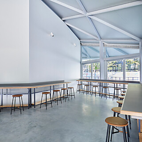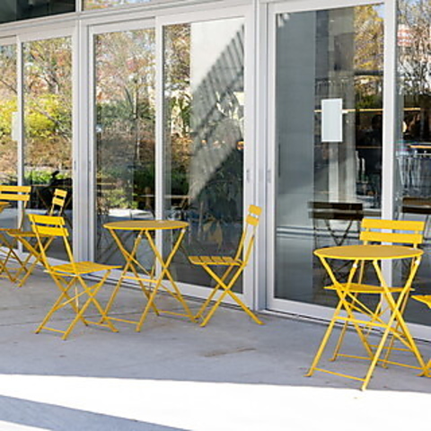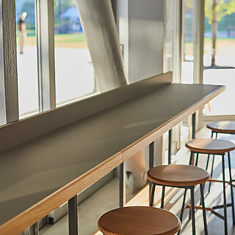 モダンで落ち着いた雰囲気が特徴の内装。高い天井と自然光が差し込む大きな窓が魅力です。89席のテーブル席と50席のテラス席を備え、開放的な空間で厳選されたメニューをお楽しみいただけます。心地よい空間で美味しいお食事と共に、特別なひとときをお過ごしください。