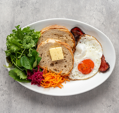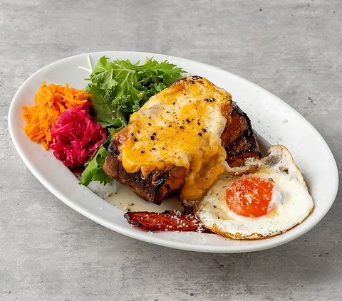 しっとりふっくらに仕上げたフレンチトーストに、とろとろチーズ、蘭王たまごの目玉焼きとカリカリのベーコンをのせました。たっぷりのメープルシロップをかけてお召し上がりください。