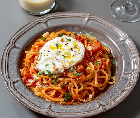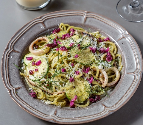 たっぷりの大葉ソースに、ぷりぷりのイカを合わせ、アクセントにしば漬けを添えた、これまでにない新しいジェノベーゼです
