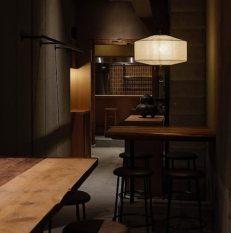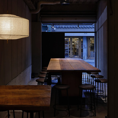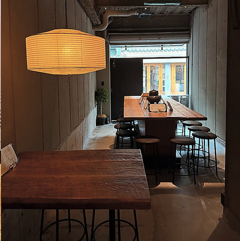 【灯りを落とした、落ち着きのある大人空間】木の温もりが心地よいテーブルと、控えめな照明がつくる静けさ。まるで路地裏の隠れ家のような、ゆったりとしたひとときをお過ごしください。
