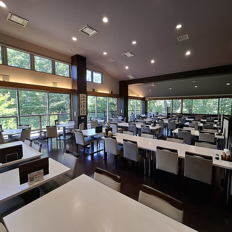 季節によって色を変える広葉樹林に囲まれた空間。広々とした落ち着きのある場所でごゆっくりとお寛ぎいただけます。記念日やご家族でのお食事、観光はもちろん。席数も60席ご用意しておりますので大人数での宴会にもご利用いただけます。