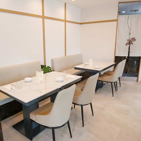 【落ち着いた雰囲気と高級感あふれる空間】白を基調とした高級感ただよう当店で、特別なひとときをお楽しみください。店内には生きた魚介が泳ぐ水槽があり、お客様が選んだ新鮮な海の幸をシェフが目の前で調理します。心ゆくまでお料理をお楽しみください。