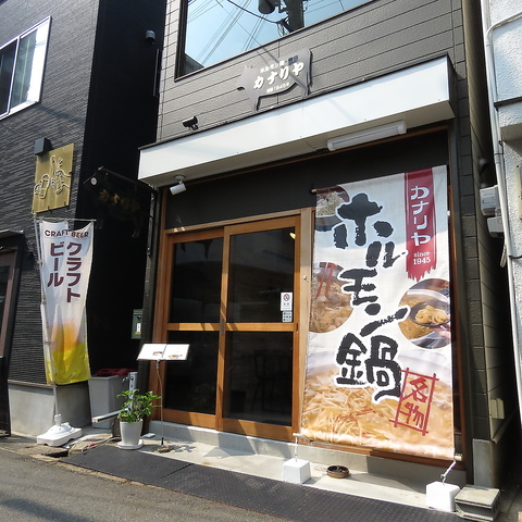姫路駅から徒歩5分、アクセス抜群の好立地。落ち着いた黒の外壁に木の引き戸が目印の「カナリヤ」は、1945年創業の老舗がリニューアルして生まれ変わったホルモン鍋専門店。店先に掲げた大きなのぼりが目印です。仕事帰りや観光帰りにも立ち寄りやすい、地元民にも愛される一軒です。