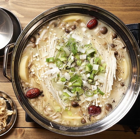 丸鶏を1羽煮込んだ濃厚スープのタッカンマリ。そのスープを存分に味わえる〆まで、ぜひお楽しみください!コースには含まれており、単品の場合は追加料金で2種類からお選びいただけます。当店のおすすめは、もちもちの韓国うどんの「カルグクス」!濃厚スープでじっくり煮込んで、ぜひ「タッカルグクス」としてご堪能ください。