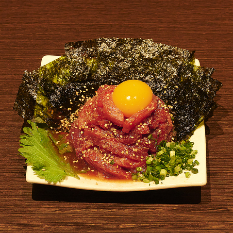 マグロのほほ肉を自家製ユッケのタレで揉み込んであります。生卵をくずして韓国海苔で巻いてお召し上がりいただきます♪食感、味、共にまさに牛のユッケ。牛のユッケがなかなか食べられなくなった今、ユッケ好きの方には嬉しい、安心安全のマグロのユッケを是非ご賞味下さい★ (※数量限定)