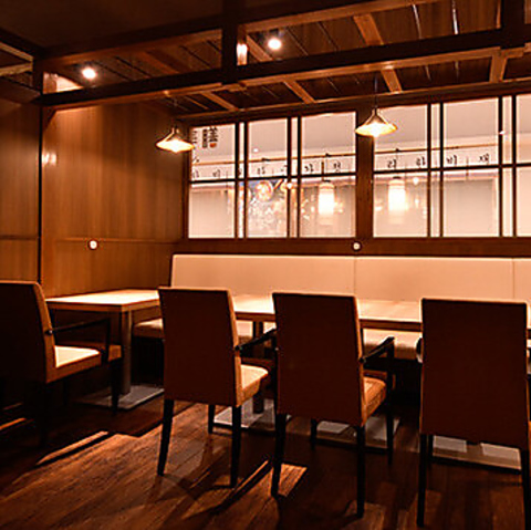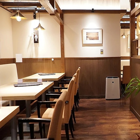 洗練されたオシャレな空間で、ゆったりとお食事をお楽しみいただけます。木目を基調とした内装と暖色の照明が、心地よい温かみを演出し居心地も抜群。テーブル席は広々としており、お1人様からグループまで、様々なシーンでご利用いただけます。