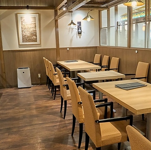 ゆったりと座れるテーブル席が並ぶ店内は、開放感あふれる空間。少人数から大人数での集まりにもピッタリ