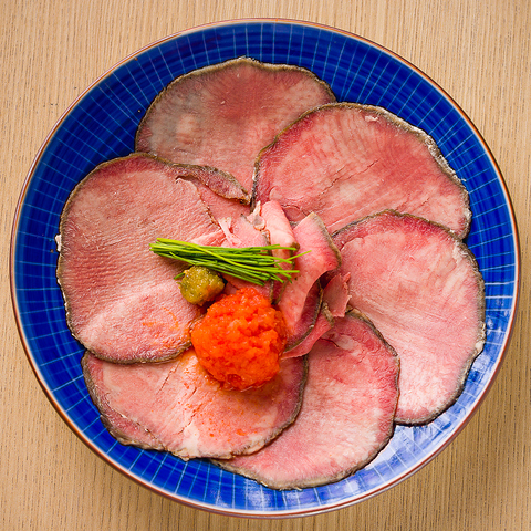 12時間じっくり低温調理で仕上げた厚切り牛たんは、やわらかさとレア感が絶妙なバランス。旨みが凝縮されたたんを、生胡椒・スモーク塩・本わさびでシンプルに引き立ててお楽しみください。