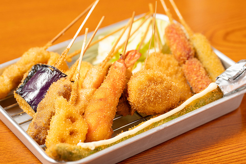 揚げたてサクサクの衣を、秘伝のソースにドボン!お肉や野菜の旨味が口いっぱいに広がる、大阪自慢の逸品。
