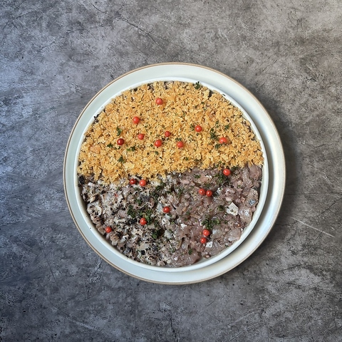 INでしか食べれないスペシャリテ!塩締めした鯵を食感を残したタルタル風に。生や炙りでパン粉と合わせると新食感なINの鯵フライをお楽しみ頂けます。