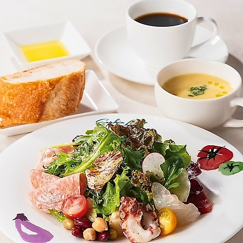 コースの幕開けを飾るのは、「彩りある前菜盛り合わせ」です。 見た目の美しさはもちろん、素材ごとの食感や香りの変化を大切に、一品ずつ丁寧に仕立てています。メインディッシュへの期待を高める、目にも鮮やかな一皿から始まる贅沢なランチタイムをお楽しみください。