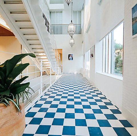 モダンな意匠のペンダントライトが映える白いタイル貼りの吹き抜け空間。優雅な雰囲気の中でおくつろぎいただけます。