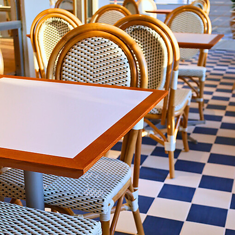 見た目に爽やかなタイルを敷き詰めたダイニングフロア。お二人様用のテーブルを多数ご用意しております。