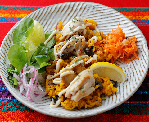 カフェの人気皿盛りパエリア、パエリータ タパスのトッピングも色々できますよ!!コロッケ各種、生ハム、トルティージャなど お弁当もあります!