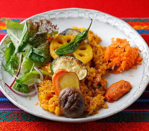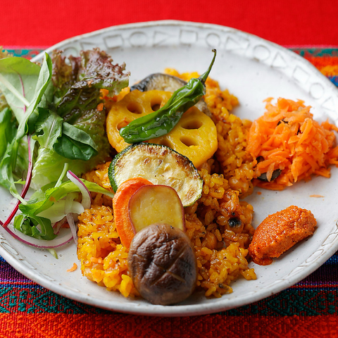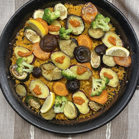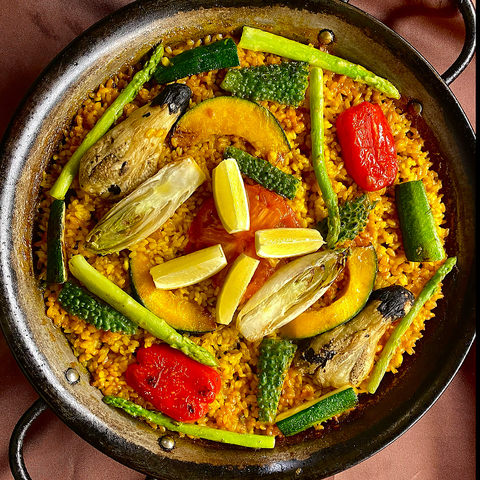 最近人気が出てきてるのが、たっぷり野菜のパエリア、ローストアーモンドとローストパプリカのソースと一緒にお楽しみ下さい