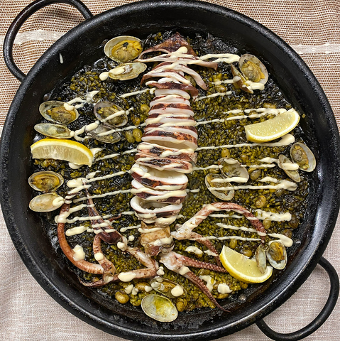 大きな鍋で焼き上げたパエリアをお一人様用に盛り付けたパエリータ スペインのバルスタイル!!