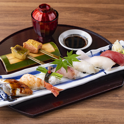 かんぱち/サーモン/いか/海老/鯛/ひらめ/あじ/鰻/本まぐろ/トロなど豊富なネタをご用意しております!また、絶品の『和牛霜降りあぶり寿司』もございます!