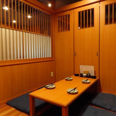 当店の完全個室は、6~10名様までご利用いただける落ち着いた空間です。和の趣を大切にした内装で、プライベート感を重視しています。ゆったりとした座布団付きのテーブル席があり、くつろぎながらお食事を楽しむことができます。特別な集まりやビジネスシーンにも最適で、周囲を気にせず大切な時間を過ごせます。