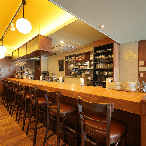 【オープンカウンターが特徴!】シェフの調理風景を間近で見ることができる、オープンカウンターがあるお店です。料理ができていく様子を眺めながら、楽しいひとときをお楽しみいただけます◎仕事終わりのサク飲みや友人との飲み、ランチなど、様々なシーンでご利用いただけます!