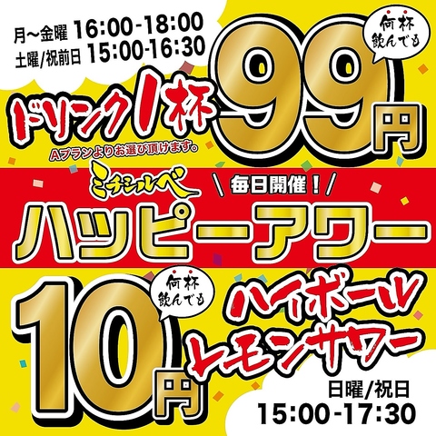早い時間のご来店が更にお得★月~土は各種ドリンクが1杯99円!日・祝は対象ドリンクが1杯10円に!!