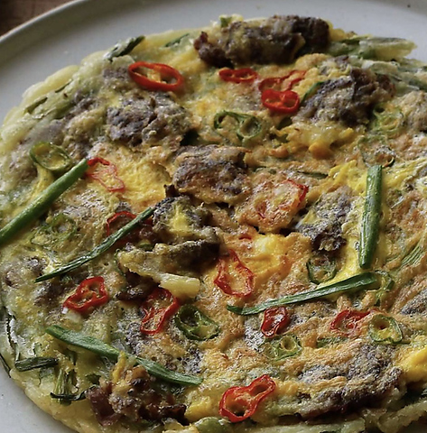 チヂミの中に大きなニラと牛肉プルコギが入っていて、他の日本の韓国料理店ではあまり見かけない珍しい料理です。