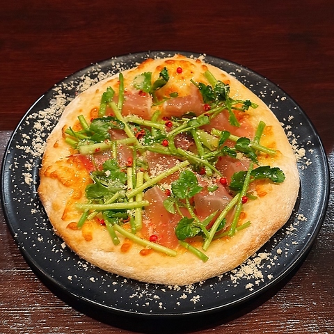 これまでにないピザがここに!ピザなのにカルボナーラというインパクトのある料理です♪真ん中に温泉卵が乗り、卵とホワイトソースの濃厚さ。見た目もピザなのに不思議な一品です!熱々の生地とクリーミーなソースが絡み合い、口の中で絶妙なハーモニーを奏でます♪