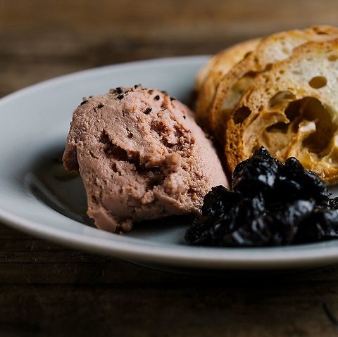 自家製ブレンドのレバーペースト。濃厚なうえにクリーミーな味わい。カリカリのバケットにつけてお召し上がりください。