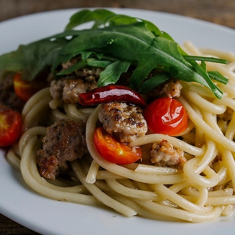 ハーブがふんだんに効いたサルシッチャを使ったペペロンチーノ。生パスタのもちもち感も癖になります。