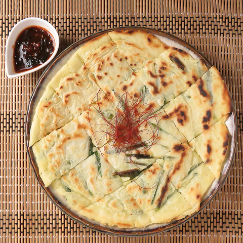 ニラ、キムチ、チーズ、海鮮の4種類を一度に楽しめる贅沢な盛り合わせです。外はパリッと、中はふんわりとした食感が絶妙で、ビールのお供にもぴったり。韓国の味を存分に堪能できる一皿です!