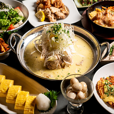 本場・韓国では薬膳としての色が強い参鶏湯。当店では、細部にまでこだわり日本人好みになるよう趣向を凝らしてお届けします。ひな鶏を丸ごと使い、中にはもち米や朝鮮人参、なつめ、栗、ニンニクなどを丁寧に詰めています。10時間以上じっくり煮込むことで、肉はホロホロと柔らかい仕上がりに。7時間かけて仕上げた濃厚なスープも魅力です!