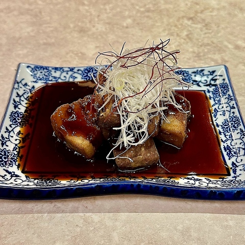 やわらか豚肉をカリッと揚げて香り高い黒酢タレで絡めました