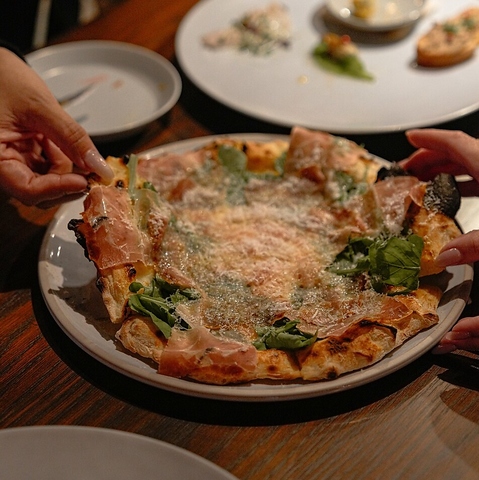 生地から手作りのピッツァ。薄めの生地はカリッと香ばしく、内側はもっちり。食べ応えと軽やかさを両立させました。職人が石窯で焼き上げます。