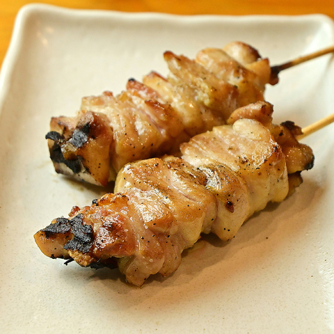 当店自慢の焼き鳥は鹿児島県産の地鶏を使用し、手打ちで炭火焼きに仕上げています。他にも【鶏もも・鶏かわ・砂ずり・豚バラミルフィーユ・豚バラしそ巻きなど、多彩なメニューを取り揃えています。串ごとに異なる塩を使い分け、素材の旨みを引き立てる一品をお楽しみいただけます。焼きたてをご堪能ください。