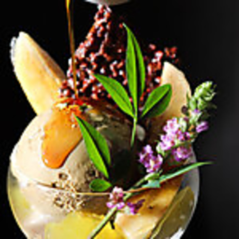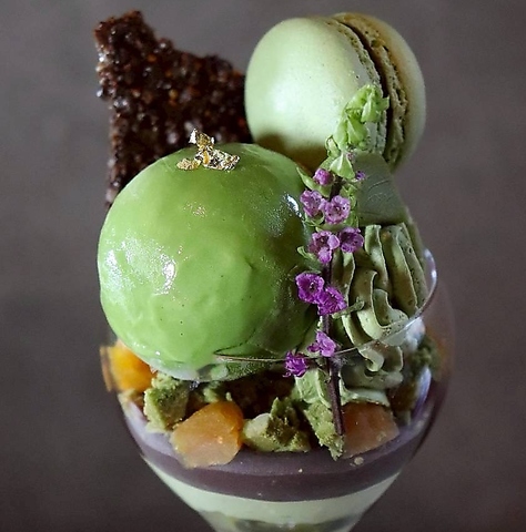 日本庭園をイメージし、緑の濃淡が美しいパフェ。香り高く奥深い抹茶の味わいをお楽しみいただけます。四季柑とも言われるカラマンシーのジュレと、セミドライアプリコットで程よい酸味と食感のアクセントを抹茶のクリームとこしあん、抹茶チョコクランチでコクのある和の味わいを重ねています。仕上げに抹茶ソースやゲランド塩をかけていただくと甘さや苦味が引き立ち、印象が変わります。最後までお楽しみください。