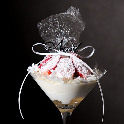 美しい雪景色をイメージした、苺と柚子のパフェ異なる白で層を重ねることで、見た目も美しく、奥深い味わいのパフェに仕上がりました。最後に、雪をイメージしたパルミジャーノチーズをたっぷりとかけてお召し上がりください。芳醇なチーズと、爽やかな柚子の香り、瑞々しい苺の組み合わせを是非お楽しみください。