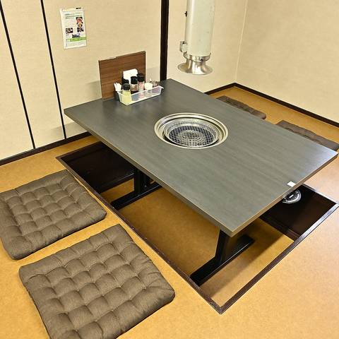 【掘りごたつ席】足を伸ばせる掘りごたつ席は、焼肉を楽しむのにぴったりな居心地の良さをご提供します♪お子様連れのお客様にもおすすめのお席です!4名様席、6名様席がございますので、人数に合わせてご案内いたします!会社終わりの宴会から休日でのご利用までご活用ください!