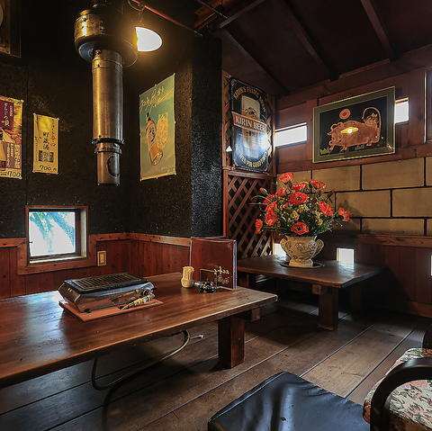 古民家を改装した店内は、古き佳き和の情緒漂う和みの空間。暖簾をくぐると、その先にはアンティークモダンな世界が広がります。木のぬくもりを感じながら団欒の時を過ごすお座敷や、ちょっとしたお集りや飲み会にも使いやすいテーブル席もご用意!選りすぐりの黒毛和牛を使用しております♪