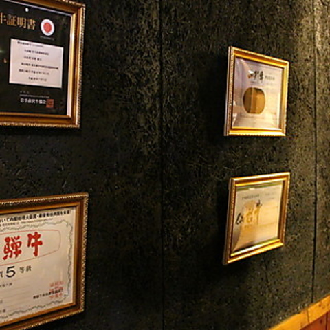 信頼の証である、取り扱う黒毛和牛の「証明証」を店内にずらりと展示しております。ご自由にご覧下さい♪