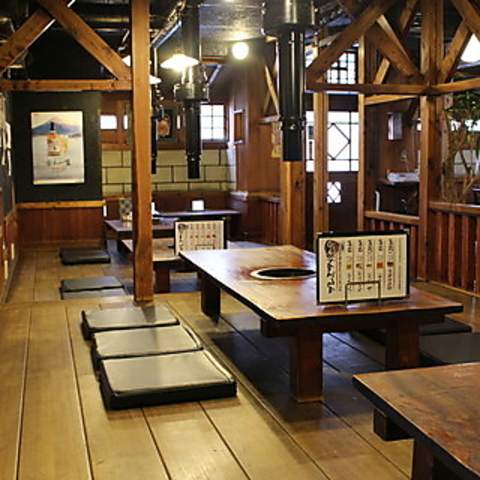 広々としたお座敷席は、開放感あふれるデザインが魅力です。大きなテーブルを囲んで、みんなでワイワイと焼肉を楽しむのにぴったりのスペースです。座布団でリラックスしながら、心地よい雰囲気の中で食事ができます。友人同士の集まりやファミリーにも最適で、特別なひとときを演出します。