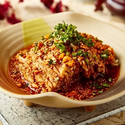 中国語で「口水」とは「よだれ」を意味します。料理名の由来は、四川省出身の二十世紀中期に活動していた文筆家の郭沫若。自著で、「故郷の四川省で少年時代に食べた、辣油や花椒で味付けした茹で鶏を思い出すと、よだれが出る」と書いたことから、この料理が名づけられました。厳選ワインと共に優雅なマリアージュを是非…