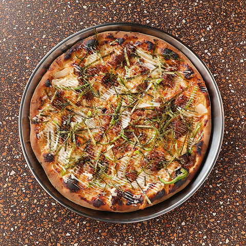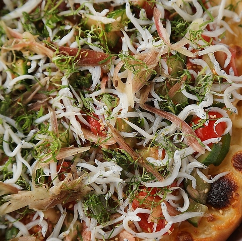 しらすの旨みがベースに広がり、みょうがの爽やかな香りと大葉の清涼感が一口ごとに感じられます。そこに梅肉の程よい酸味が加わり、全体の味わいをキュッと引き締めることで、さっぱりとしながらも深みのある和の風味が楽しめる一品です。暑い季節や食欲が落ちた時にもぴったり。新感覚の和風ピザをぜひお試しください。