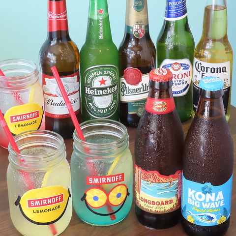 ビール、ハイボールはもちろん、カクテルも多彩にご用意しております!またソフトドリンクとレモネードもあり、お酒が苦手な方でも思いっきり楽しめます!ティータイムも仕事終わりの飲みもハワイアンな雰囲気の当店で乾杯を♪