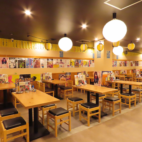 【大衆居酒屋】お祭り気分になれると好評の内装です!自慢の居酒屋料理と激安ドリンク何杯でもゆったり堪能出来るように、2名席、4名席席、6名席席などレイアウト様々に、多種多様なお席をご用意しておりますので様々なシーンに対応可能!名物のでか唐揚げ(1個219円)は絶対食べてくれトリー!